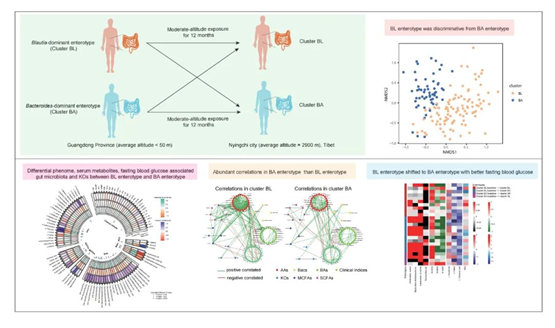 西藏林芝市是兼具旅游魅力与科研价值的“西藏江南”,是生物多样性研究、高原气候观测(如林芝高山生态站)及地质演化的关键区域。其垂直生态梯度与独特地理环境,为探索自然与科学提供不可替代的实地样本,科学考察与生态旅游协同发展潜力巨大,是科研与旅行者探秘的终极目的地。此前,广东省医疗援藏专家、广东省人民医院急诊科李欣教授团队牵头上海百趣代谢组学技术研究中心、中山大学孙逸仙纪念医院及其医学研究中心、林芝市人民医院等多家单位揭示了中等海拔暴露会影响人体肠道细菌和血清代谢组进而调控血糖代谢;后续又发现中等海拔暴露下健康人体内肠道多界微生态的变化与血糖和短链脂肪酸的代谢变化具有显著强相关性。但是中等海拔暴露是否会影响人体肠道微生态的肠型变化,进而导致不同人体对中等海拔暴露后的血清代谢及表型变化上呈现异质性,日前在国际上暂无报道。
