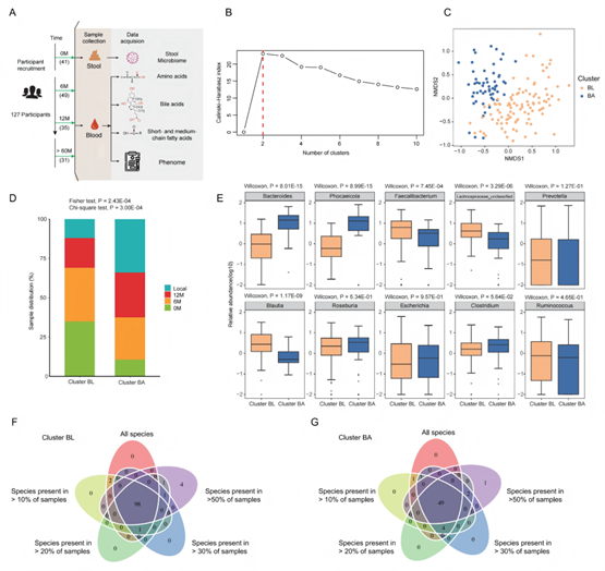 为确定最优的肠型分类方法,对从所有募集人群(包括中等海拔暴露前基线、中等海拔暴露6个月和12个月及5年以上的当地居民)中获得的粪便宏基因组数据进行分析(图1A),分别对存在于10%、20%、30%和50%以上样本中的物种或所有物种的相对丰度进行两种不同肠型模型算法分析:PAM(partitioning around medoids)和DMM(Dirichlet multinomial mixture)。结果发现,PAM在中等海拔暴露前后的个体中均识别出两种稳定的肠型:BL肠型(主要由Blautia组成)和BA肠型(主要由Bacteroides组成)(图1B),而DMM识别出的肠型则随所纳入物种的不同而出现动态波动。此外,已有研究表明DMM算法更适合于计数的16S扩增子宏基因组数据,PAM聚类方法更适合基于相对丰度的shotgun宏基因组数据,这与我们的研究结果一致。非度量多尺度分析NMDS(Non-metric multidimensional scaling)结果显示,BL肠型与BA肠型的微生物组成具有显著差异(PERMANOVA P<0.001)(图1C)。在含高丰度拟杆菌(Bacteroides)的BA肠型中,中等海拔暴露个体的占比更高;而在以布劳特氏菌(Blautia)为代表的BL肠型中,基线样本个体的占比更高;Fisher检验和卡方检验均显示,这两个聚类中人群的分布比例存在显著差异(图1D)。此外,基于同一样本应被归类到同一聚类中3次以上的标准,我们发现,当纳入存在于30%以上样本中的物种进行PAM分析时,每个肠型中同一样本的归类一致性比例高于其他条件(图1F-G)。因此,本研究后续肠型分析主要是基于PAM模型且纳入存在于30%以上样本中的物种。有趣的是,尽管DMM模型识别出的肠型会因所分析物种的比例不同而波动,但在中等海拔暴露后人群中同样识别出了含高丰度拟杆菌的肠型,表明拟杆菌驱动的肠型可能在个体适应中等海拔暴露的过程中发挥重要作用。综上所述,个体在中等海拔暴露前后的肠道菌群发生了显著变化,且可被分为两种相对稳定的肠型。