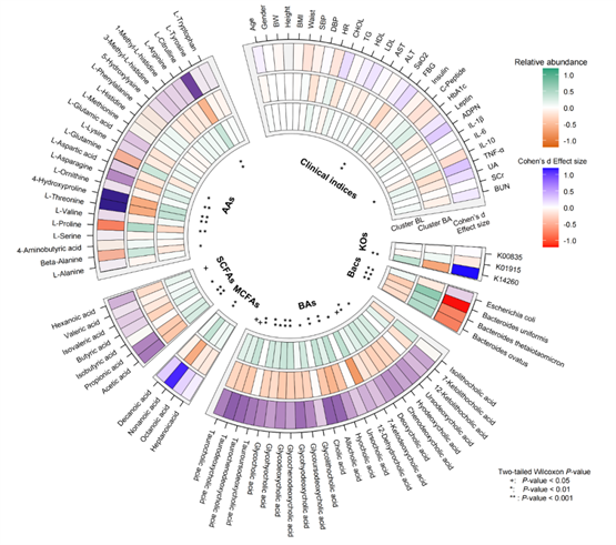 最近有研究报道,血清代谢组的改变可反映健康人群、2型糖尿病患者和汉族肥胖人群肠道菌群的差异。我们对中等海拔暴露前、暴露后6个月、暴露后12个月的个体以及5年以上的当地人群的血清样本进行了血清靶标代谢组学检测,检测指标包括24个氨基酸(Amino Acids,AAs)、7个短链脂肪酸(Short-Chain Fatty Acids, SCFAs)、4个中长链脂肪酸(Medium-Chain Fatty Acids, MCFAs)和24个胆汁酸(Bile Acids, BAs)。结果表明(图2),与BL肠型相比,BA肠型中4个AAs(L-瓜氨酸、L-天冬酰胺、4-羟基脯氨酸和L-苏氨酸,|Cohen’s d效应值|分别为0.97, 0.60, 1.21,1.13)显著降低,3个AAs(β-丙氨酸、L-脯氨酸和L-谷氨酰胺,|Cohen’s d效应值|分别为0.48, 0.77, 0.49)显著升高;4个 SCFAs(乙酸、丙酸、丁酸和己酸,|Cohen’s d效应值|分别为0.69, 0.63, 0.21,0.39)和1个MCFAs(壬酸,|Cohen’s d效应值|为1.10)明显降低;14个BAs(胆酸、牛磺胆酸、甘胆酸等,|Cohen’s d效应值|分别为0.82, 0.66, 0.63等)显著降低,且与胰岛素抵抗相关的炎症因子TNF-α在BA肠型中的水平显著低于BL肠型。这些结果表明,不同的肠道微生物肠型对血清代谢物含量和炎症水平有重要影响。