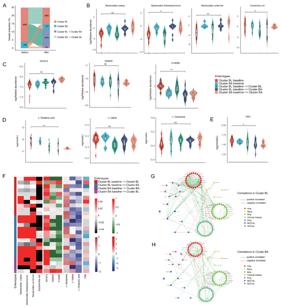 我们进一步分析了26名个体在中等海拔暴露前后的肠型变化。结果显示,84%的人群在中等海拔暴露前为BL肠型,其中40%人群在暴露后仍为BL肠型,44%转为BA肠型(图3A)。在BL肠型转为BA肠型的健康个体中,拟杆菌门物种(如B. thetaiotaomicron、B. uniformis)显著增加,而变形菌门物种(如E. coli)减少(图3B),K14260显著降低(图3C),L-谷氨酸显著降低(图3D),且FBG水平显著改善(图3E)。这些结果表明,当肠型发生改变时,特别是从BL肠型到BA的肠型转变,与FBG改善相关的肠道菌群、微生物功能及血清代谢物都发生了显著变化(图3F)。此外,本研究中发现了1名基线为BA肠型的个体转变为BL肠型(图3A),尽管由于样本量较小,不适合通过Wilcoxon检验进行统计分析,但热图显示该个体在中等海拔暴露后从BA肠型转变为BL肠型,可能对FBG、肠道菌群和血清代谢物产生不利影响(图3F)。这在一定程度上可能能够解释为什么有人在高海拔暴露后出现血糖异常,表明肠型与血糖的关系在未来值得进一步的研究。此外,我们分别对这两种肠型的血清代谢物、临床指标与上述肠道菌群进行Spearman相关性分析,结果发现BL肠型中的显著性相关关系数量多于BA肠型(图3G-H),如BA肠型中出现了胆汁酸与临床指标之间的正相关性,但氨基酸间的强正相关性出现减弱,氨基酸与其他指标间的正相关性也消失了,临床指标与其他指标间的负相关性出现减弱。这些结果表明,与BL肠型相比,BA肠型在肠道菌群组成及功能、肠道菌群与人体的血清代谢组和临床表型间的相互作用等方面上存在显著差异。