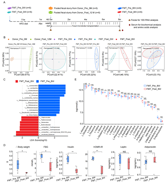 图4. FMT实验的HFD小鼠的肠道菌群组成、血清氨基酸代谢及表型的变化