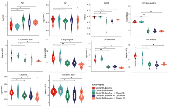 最后,我们探究了肠道菌群肠型转变对中等海拔暴露前后人体的临床指标和血清代谢物(即AAs、SCFAs、MCFAs和BAs)的影响。无论基线肠型是何种类型和暴露后肠型如何转变,人体的丙氨酸氨基转移酶(ALT)显著升高,血清肌酐(Scr)、动脉血氧饱和度(SaO₂)、4-羟脯氨酸、L-谷氨酸、L-天冬酰胺、L-苏氨酸、L-瓜氨酸、L-赖氨酸和异戊酸均显著下调(图5)。无论肠型是否转变,基线为BL肠型的人群在中等海拔暴露后,天冬氨酸转氨酶(AST)、心率(HR)和L-脯氨酸显著升高,而TNF-α、胆固醇(CHOL)、L-鸟氨酸、L-天冬氨酸、L-组氨酸、乙酸、丙酸、丁酸、戊酸、庚酸、癸酸、壬酸和牛磺鹅脱氧胆酸显著降低。与基线BL组相比,BL→BA转变组的HbA1c、异丁酸和甘氨猪脱氧胆酸显著升高,而FBG、体重(BW)、BMI、LDL、瘦素、3-甲基-L-组氨酸、辛酸、鹅脱氧胆酸、甘氨脱氧胆酸、牛磺脱氧胆酸和甘氨熊脱氧胆酸显著降低。